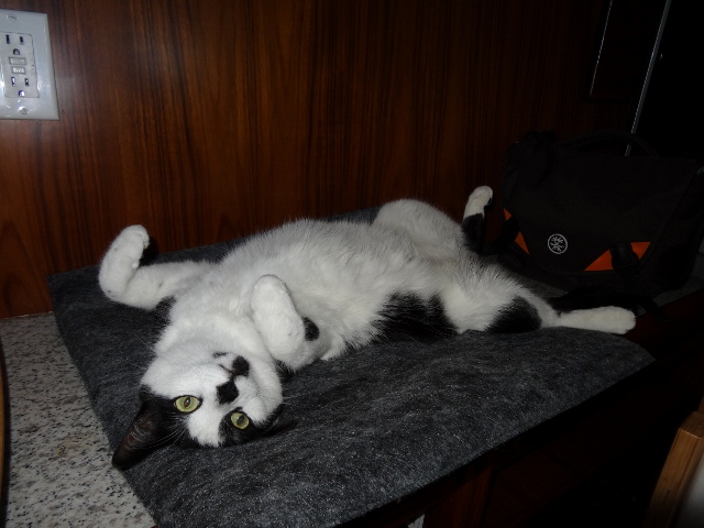 After his initial exploration of MOKEN, kitty spent most of yesterday and this morning sprawled out in various locations around the boat. He seems to be adjusting slowly. I think he may go a little stir crazy in here once his energy level gets back to normal.