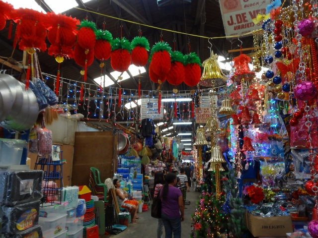 We wandered around and checked out the different areas first. At one vegetable stall, where the ladies spoke very little English, Sachi and I tried to figure out what some of the vegetables were with no luck. Next we stopped for a snack of fried bananas (14 pesos) and little ham and cheese pockets (two for 14 pesos) to give us energy for shopping.