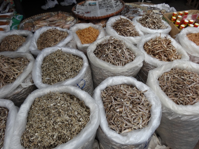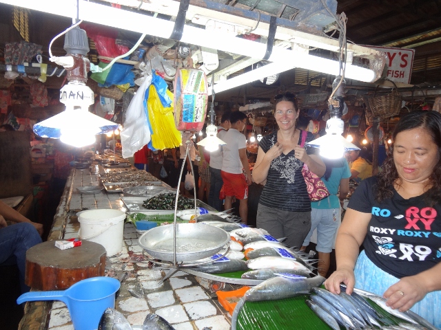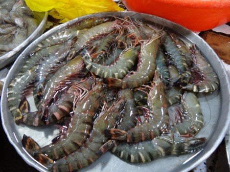 I decided not to buy any fish or meat today. Mostly because I wasn’t sure how long it would be before I’d get back to the boat. Besides, what do I know about cooking a whole fish (head on, guts in)? Where I come from, fish comes pre-cleaned. I’ll leave that for next time. Or maybe just stick to the big jumbo prawns or little squid.