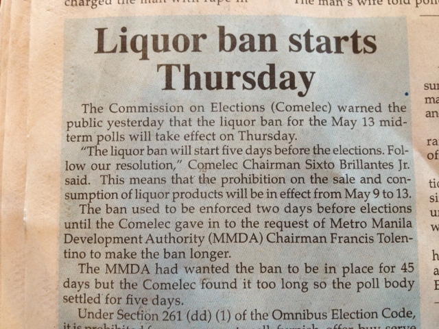 Liquor Ban Announced Published May 7, 2013 at 640 × 480 in Election Day…Worlds Apart ← Previous Next → A gun ban was imposed on January 13, 2013 and runs for six month. A five-day liquor ban starts on May 9 and runs until election day, May 13.